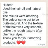 Hi dear, Used the hair oil and natural dye. The results were amazing. The colour came out to be quite natural. And the texture of the hair was very smooth, unlike the rough texture after chemical dyes. Thank you for your amazing products.